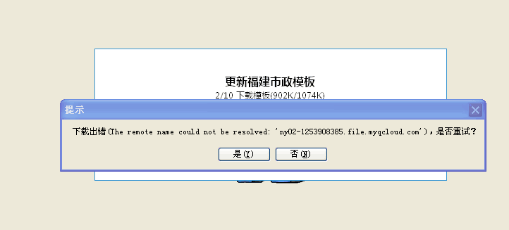 22.更新单机版 1.更新模板时出现异常提示,下载出错(The remote name could not be resolved: ‘ny02-1253908385.file.myqcloud.com’),是否重试? 更新模板时出现异常提示,下载出错(The remote name could not be resolved: ‘ny02-1253908385.file.myqcloud.com’),是否重试? 解决办法: 检查客户网络情况,确认网络连接不稳定,重新更新就可以了,如果没有正常更新信息,直接发新版软件替换测试效果。