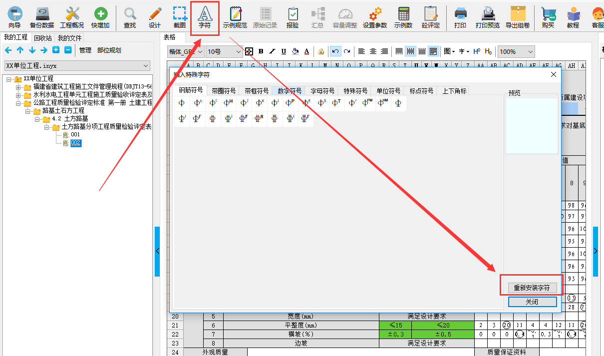 20.字符 4.钢筋字符不显示,显示方框 钢筋字符不显示,显示空白方框,上角标也消失 解决办法: 点击【字符】→【重新安装字符】重新打开【字符】,或者强制安装字符,还是没有解决问题,将客户电脑字体:楷体GB2312删除,重新打开软件就可以了。 强制安装字符操作:找到【控制面板】→【字体】→找到软件安装文件位置里【zujian】文件夹→复制字符,粘贴到字体库里,重新打开软件就可以了。