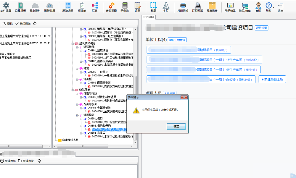 新建表格异常提示:应用程序异常:磁盘空间不足。