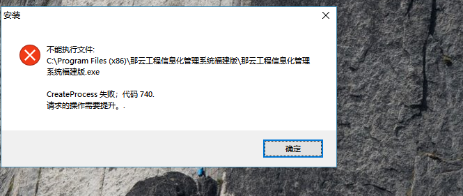 24.软件安装单机版1.单机版软件安装时出现异常提示 安装软件时出现异常,不能执行文件:C:\Program File(x86)\那云工程信息化管理系统福建版\那云工程信息化管理系统福建版.exe 安装软件时出现异常,不能执行文件:C:\Program File(x86)\那云工程信息化管理系统福建版\那云工程信息化管理系统福建版.exe CreateProcess 失败;代码740.请求的操作需要提升。 解决办法: 客户安装的软件版本不对应,重新安装软件,打开就可以了